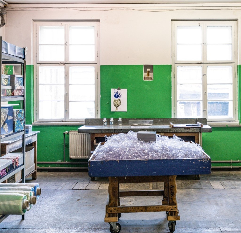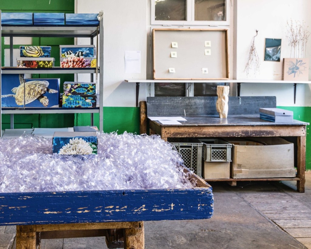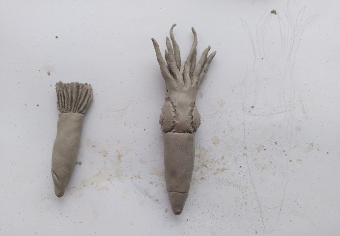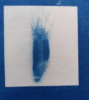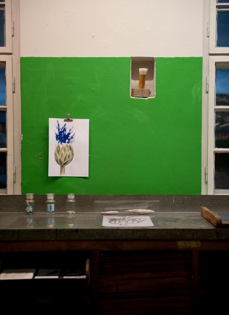 Bezugnehmend auf den Projekttitel der Ausstellung „Kapsel-Käpsele“, ist der Ursprung dieser Arbeit eine Samenkapsel. In der prozessorientierten und ästhetisch forschenden Auseinandersetzung mit der Kornblume (Centaurea cyanus) wurde eine Ähnlichkeit zwischen Kornblumensamen (Achäne) und Tintenfischen (Coleoiden) entdeckt. Basierend auf dieser Entdeckung entstand eine Rauminstallation als Labor der Analogie von Blütenkapseln des Korbblütlers Kornblume zu Kopffüßlern, den Tintenfischen – als besonders intelligent geltende „Käpsele“ (Süddeutsche Bezeichnung für besonders kluge Wesen) der Tiefsee.